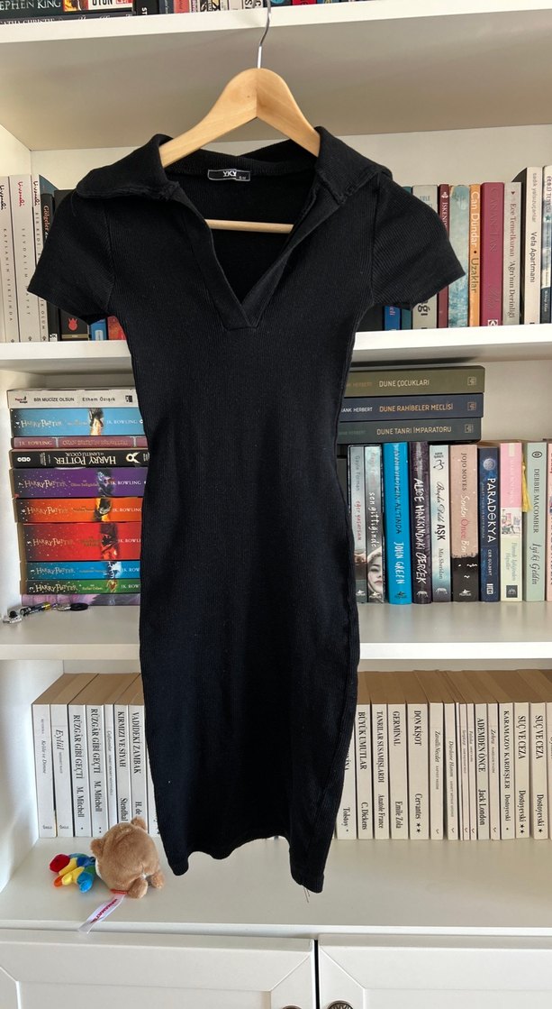V yaka ve kısa kollu, siyah midi elbise. Düz ve şık tasarımı, ofis için rahat ve şık bir görünüm sunar.