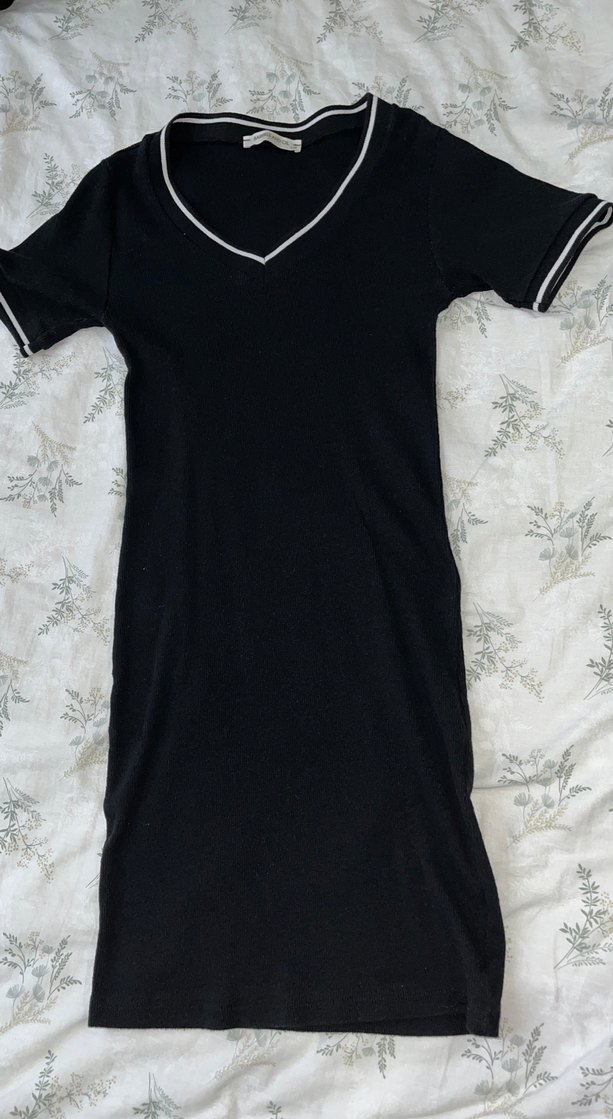 V yaka ve kısa kollu, beyaz şerit detaylı siyah midi elbise. Rahat ve şık, sentetik kumaştan günlük kullanım için uygundur. xxs icin daha uygun olabilir barrels and oil marka