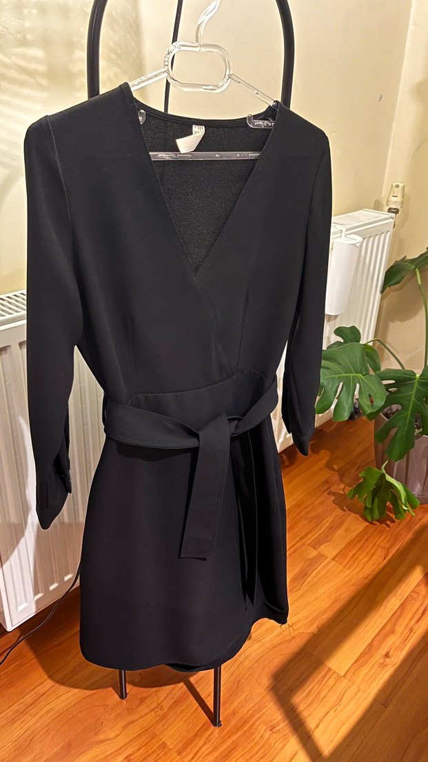 V yaka ve uzun kollu, beli kemerli siyah midi elbise, klasik şıklık ve ofis kullanımı için uygun.