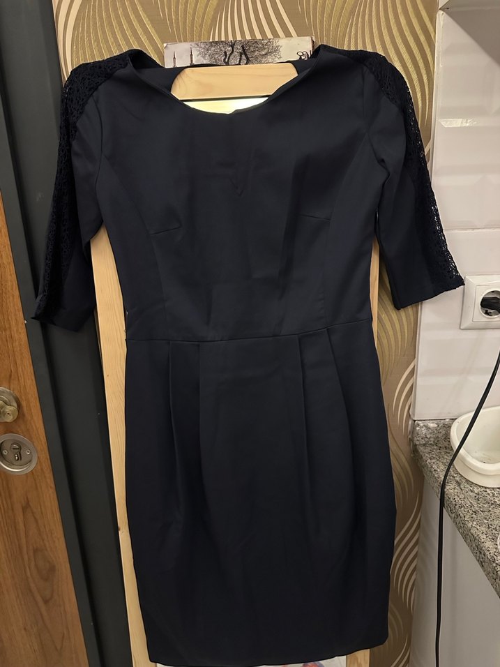 V yaka, pilili detaylı, kısa kollu siyah midi elbise. Ofis ortamına uygun, şık ve hafif gotik tarzda tasarlanmıştır.