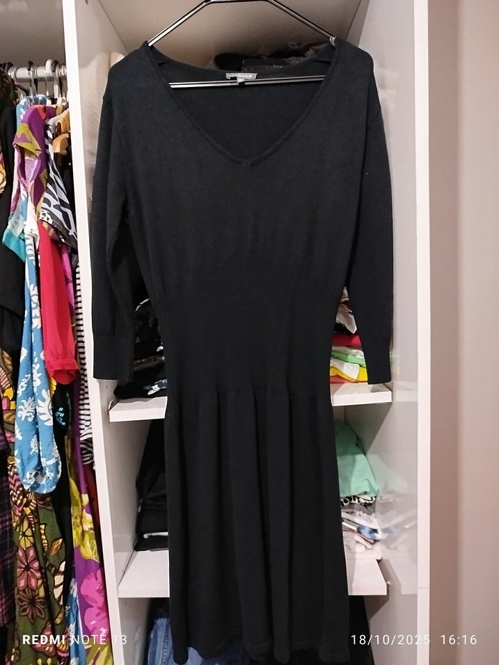 V yaka ve uzun kollu, siyah piliseli midi elbise. Yumuşak sentetik kumaştan, günlük kullanıma uygun. iki koltuk arası 44 boy 102 esnek triko kumaş