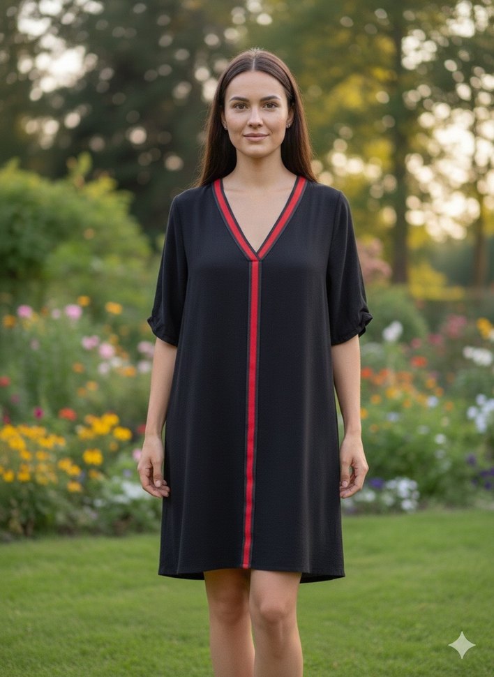 V yaka ve kısa kollu, siyah midi elbise. Rahat kesim,tasarım ve kırmızı ince çizgilerle sade şıklık sunar. Günlük kullanım için uygundur. Öze bir yemekte rahat şıklık kazanmak için ideal. Çok ağır kumaşı harika bir elbise zara marka etiketi kesik elimde M-L-XXL var istediğiniz beden için bana yazın #zara #zaraelbise