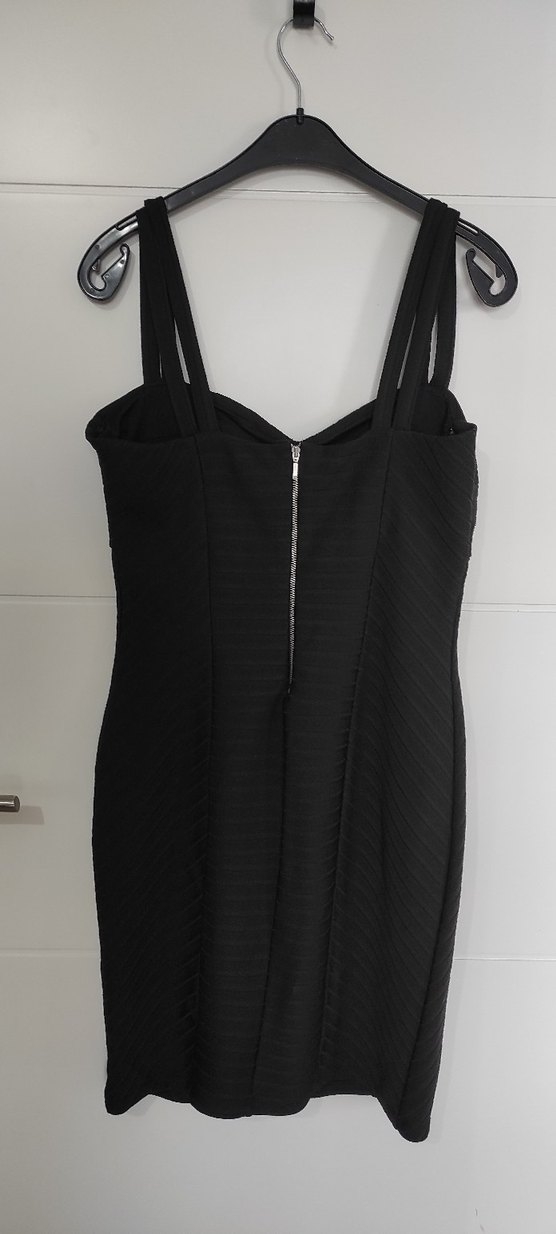 V yaka, önden fermuarlı, siyah midi elbise. İnce askılı, vücuda oturan kesimiyle gotik tarzda şık bir seçim.