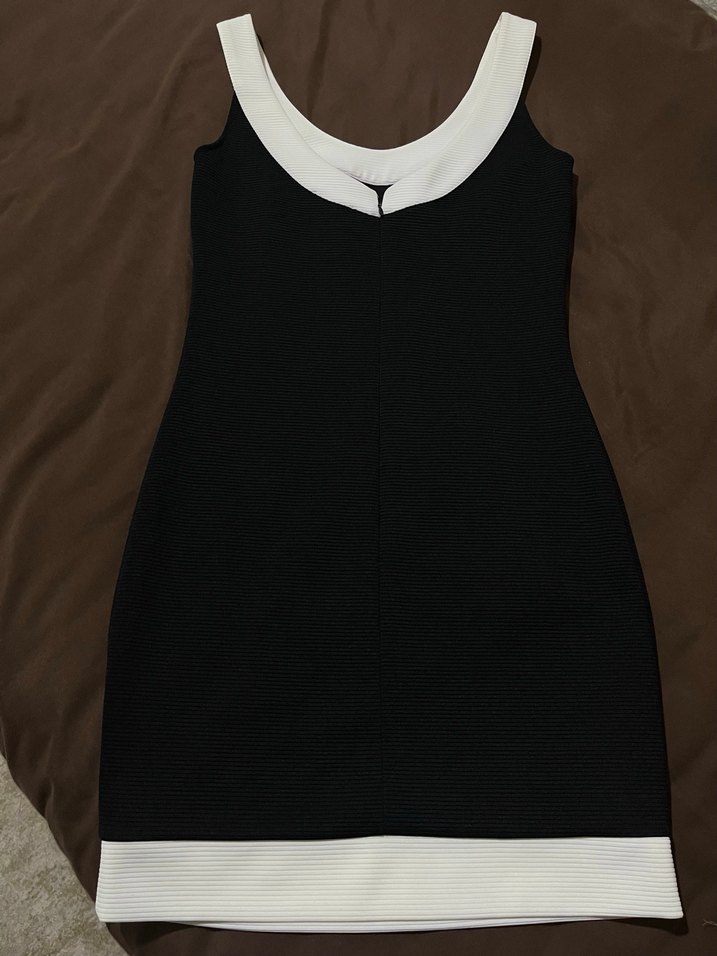 V yakalı, kolsuz, siyah triko elbise, beyaz yakası ve eteği ile minimal ve gotik tarzda günlük kullanım için uygundur.