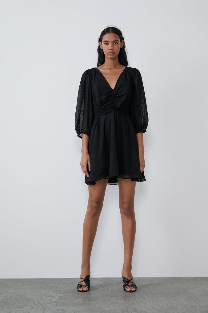 V yakalı, drapeli kısa kollu ve bol kesimli siyah mini elbise. Sentetik kumaştan yapılmış, ince puantiyeli desene sahip, romantik akşamlar için uygun.