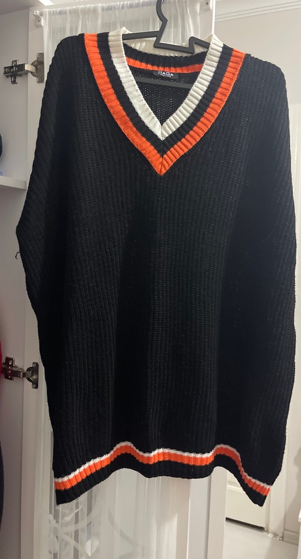 Siyah örgü kadın kazak, V yaka ve bol kesimlidir. Yün malzemeden üretilmiş olup, günlük rahat kullanıma uygundur. Yaka ve etekte turuncu-beyaz şeritler bulunur.