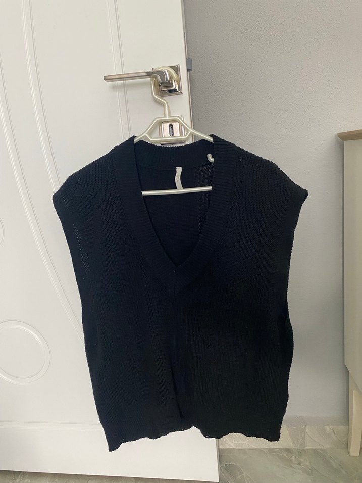 V yakalı, siyah, örgü kadın süveter. Kolsuz ve bol kesim, günlük sokak stiline uygun midi uzunlukta minimal bir parça.