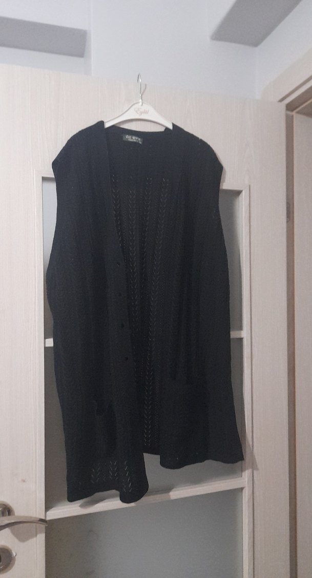 Siyah örme kadın yelek, kolsuz, bol kesim ve V yakaya sahiptir. Midi boyda, rahat ve günlük kullanıma uygun bir modeldir.