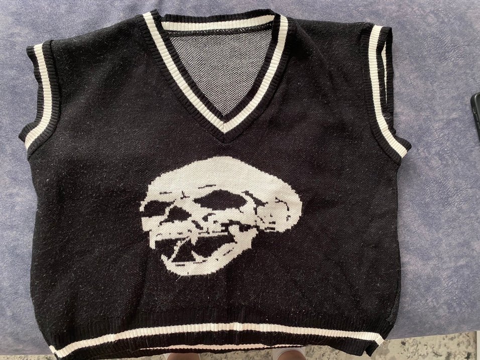 Siyah örgü yün triko süveter, V yaka ve bol kesim. Önünde cesur bir kafatası deseni bulunur, gotik ve grunge punk tarzını yansıtır, uzun kollu ve normal uzunluktadır.