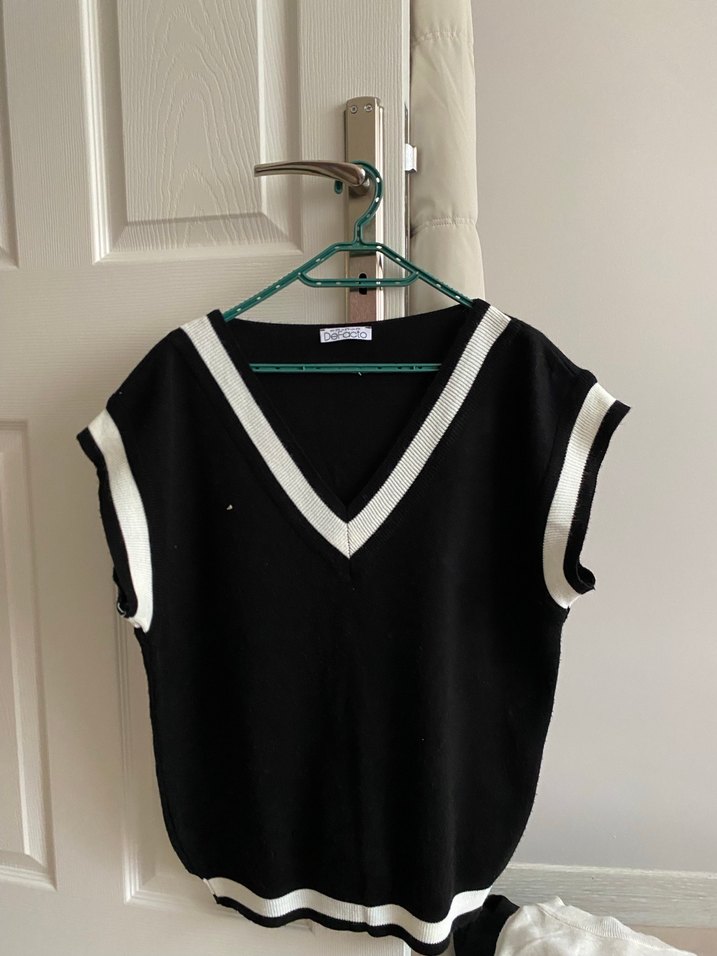 V yaka, siyah pamuklu örgü süveter, salaş kesim ve kolsuz. Günlük kullanım için midi boy, desen içermeyen rahat bir parça.