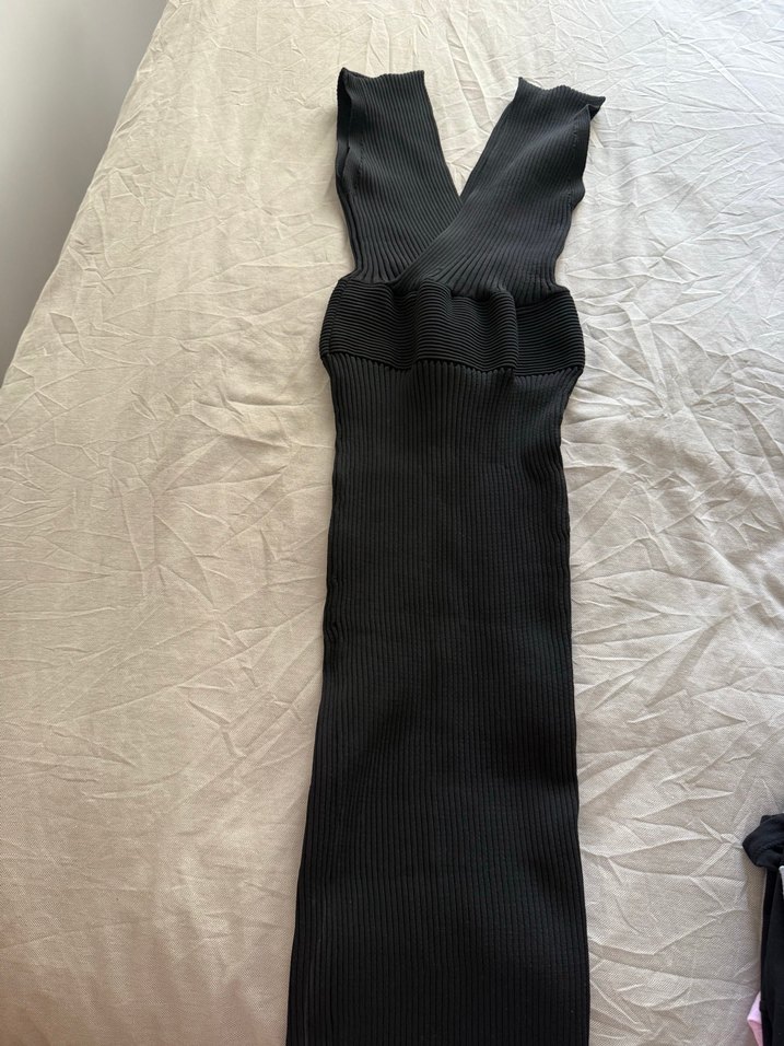 V yakalı, askılı, pilili detaylara sahip siyah uzun elbise. Sentetik kumaştan üretilmiş, sade ve şık bir tasarım. Günlük kullanıma uygun.