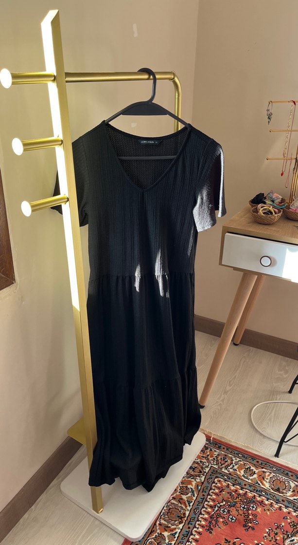 V yaka ve kısa kollu, siyah uzun elbise kalıbı büyüktür M bedene uyar