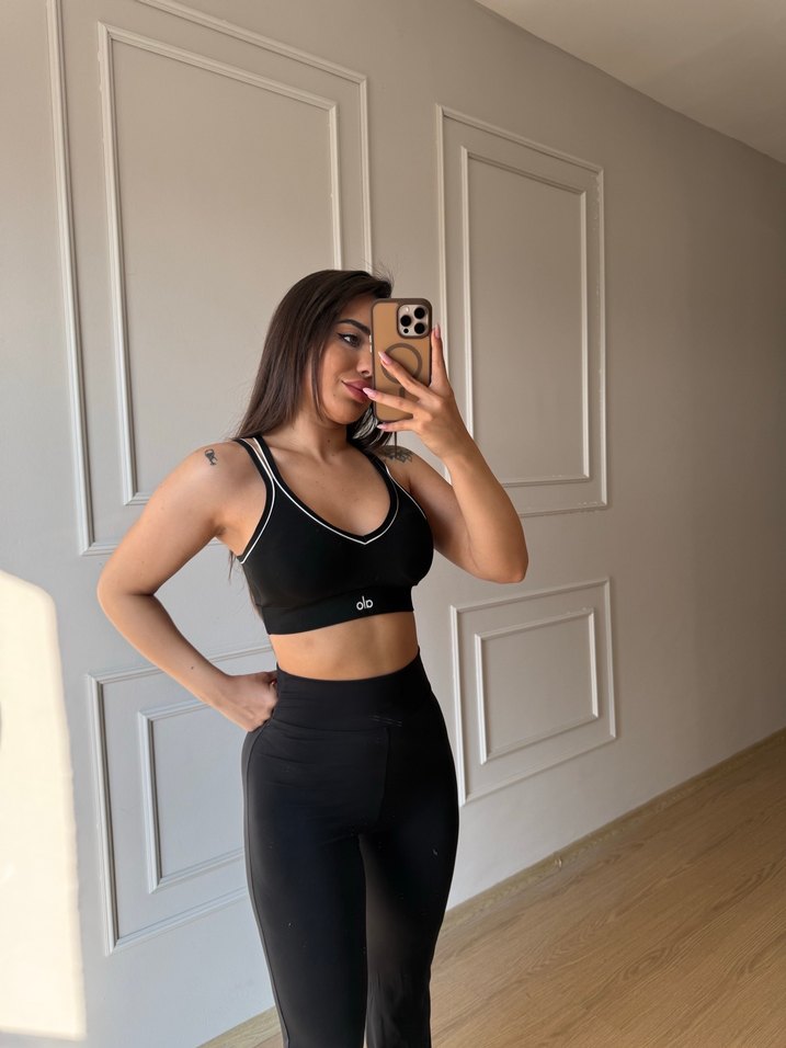 V yaka ve ince askılı, siyah renkli, vücuda oturan spor büstiyer. Pürüzsüz sentetik kumaştan, zahmetsiz şıklık sunar.