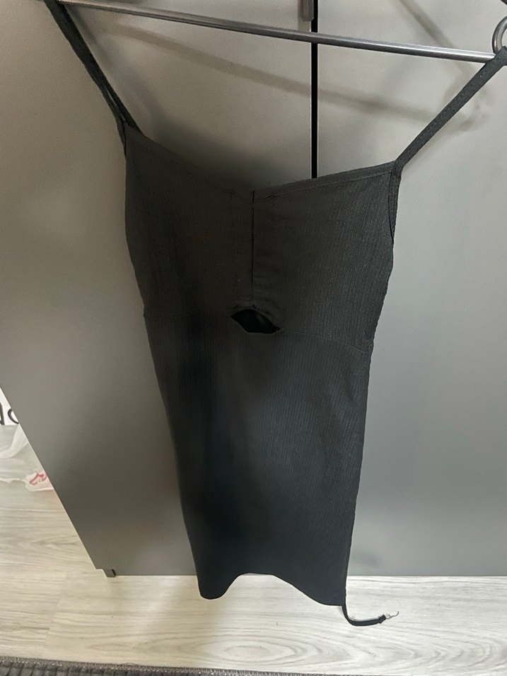 V yakalı, ince askılı ve yırtmaçlı siyah midi elbise, sentetik kumaştan üretilmiştir. Minimalist gotik tarzıyla günlük kullanıma uygundur. Ön kısmındaki büzgü ayrılarak pencere bölümü açılabilir.