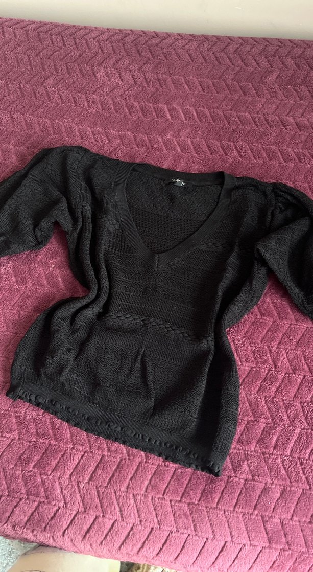 Siyah renkli, V yaka ve uzun kollu, örme kadın kazak. Salaş kesim ve orta boy uzunlukta, rahat goth tarzı sunar.