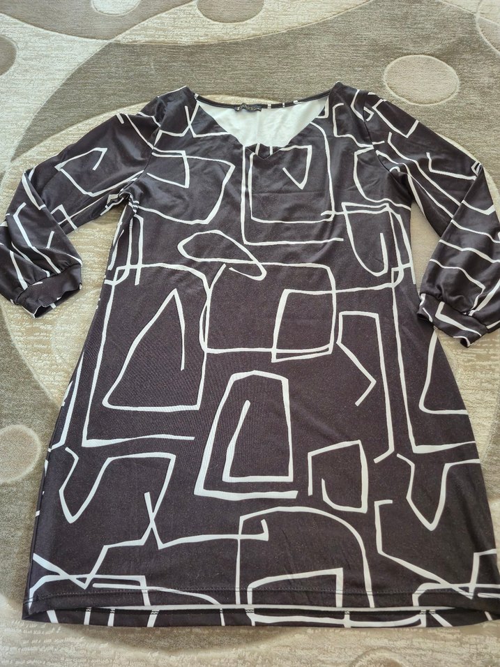 V yaka, uzun kollu, bol kesim siyah üzerine beyaz desenli elbise, Sentetik kumaştan, drapeli ve modern geometrik desenli. Günlük kullanım için uygundur. esnektir XL ve 3 XL beden ARASI sorunsuz defosuz MARKA TEMSİLİDİR