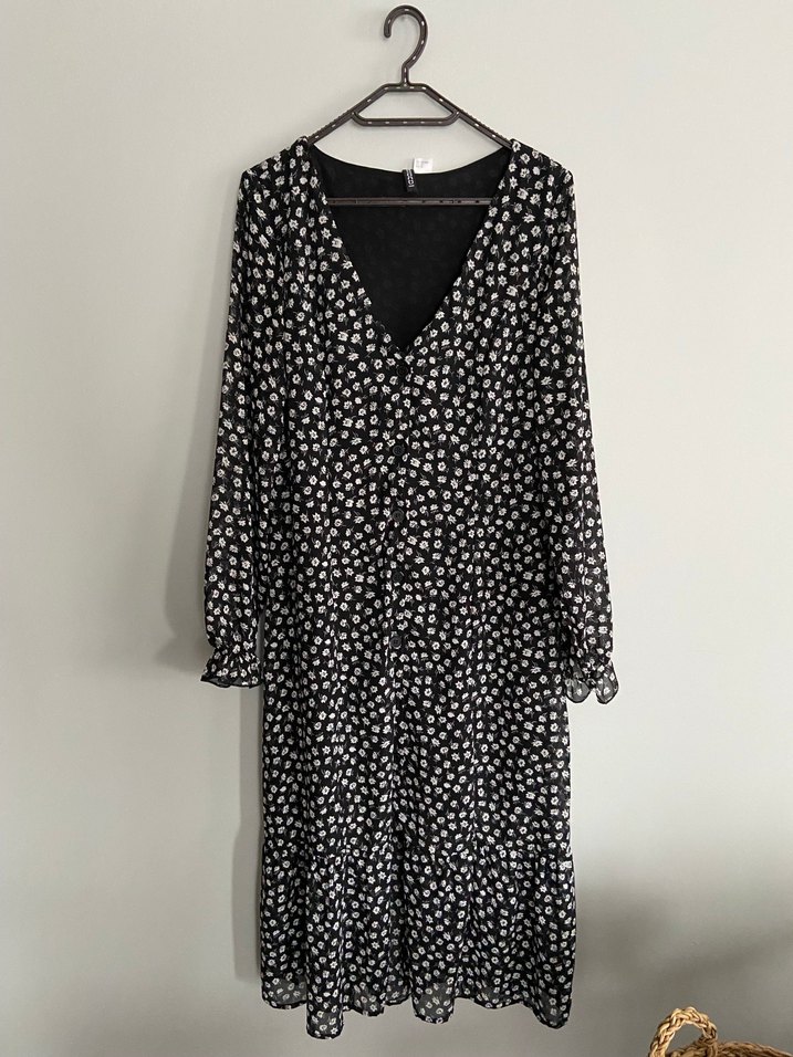 V yaka, uzun kollu siyah elbise düğmeli ve bol kesimdir.günlük kullanım için uygundur. Astarlı iç göstermez hiç bir defosvs yok