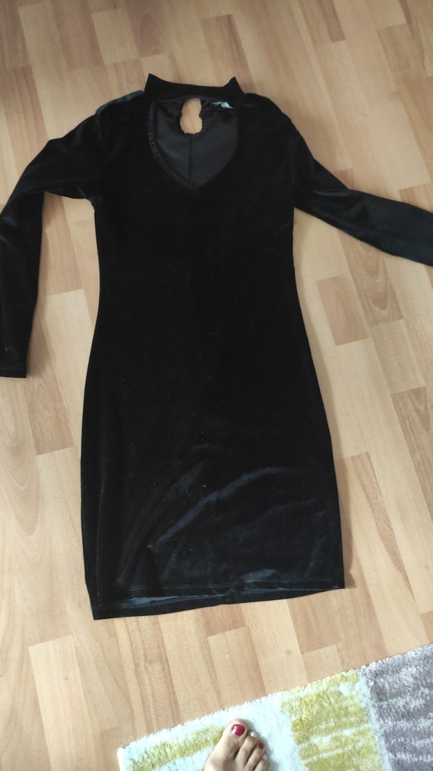 V yakalı, uzun kollu, siyah ve drapeli bu midi elbise, romantik akşamlar için ideal.