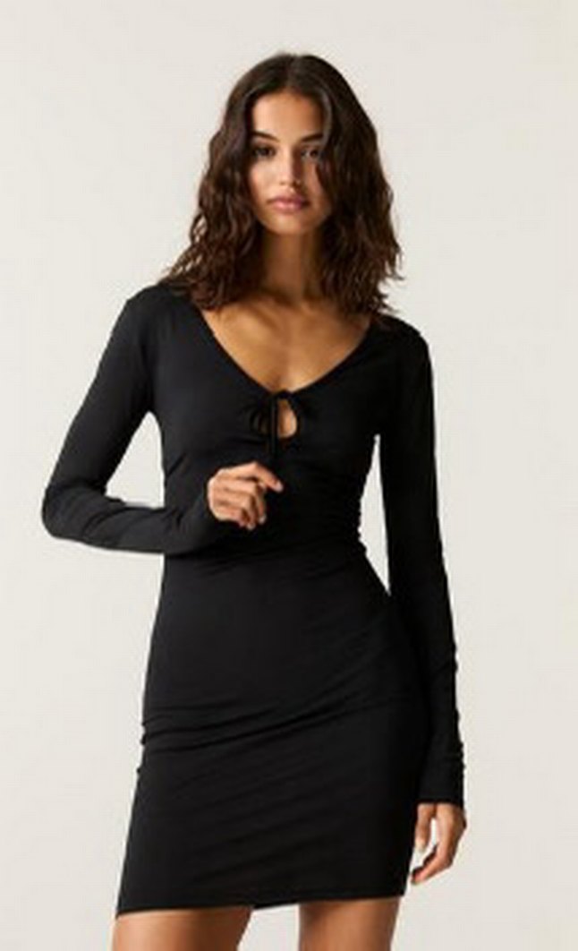 V Yaka Siyah Uzun Kollu Mini Elbise