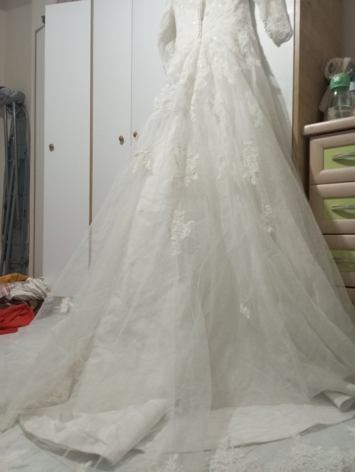 Vintage esintili prenses gelinlik, V yakalı ve askılı kollu, vücuda oturan kesimiyle klasik şıklık sunar. Uzun beyaz etekleri dantel detaylıdır. sevme bedene uygun olur diye düşünüyorum kuru yıkama yapılması gerekiyor başka bir problemi yok uygun fiyata koyuyorum alan kişiye hayırlı olsun