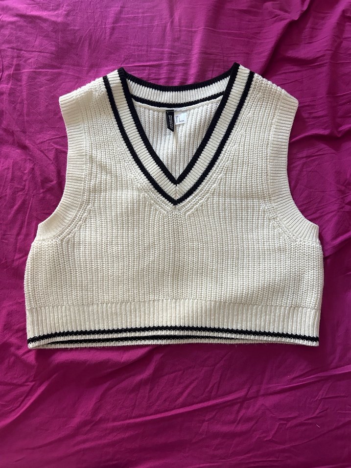 V yaka, triko örme beyaz süveter, salaş kesim ve kolsuz tasarıma sahip. Günlük kullanıma uygun, rahat ve şık bir parça.