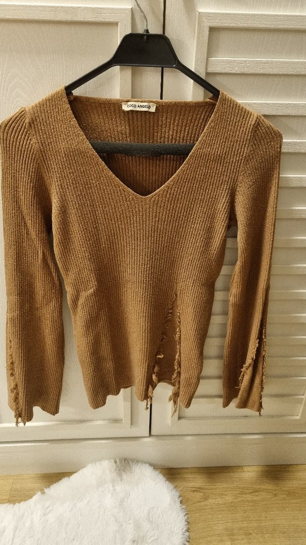 Taba renkli, V yakalı, uzun kollu, likrali kazak. Standart beden ürün giyilmemiştir.