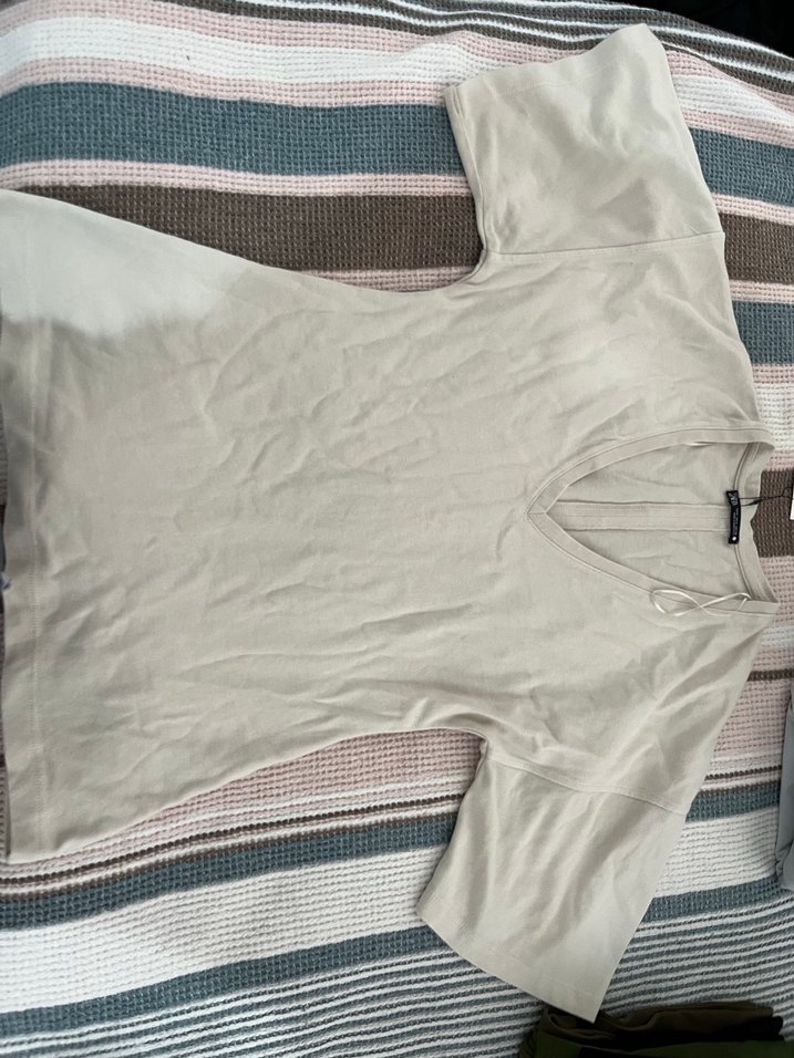 V yaka, kısa kollu ve keten kumaştan üretilmiş, bej renkli, normal boyda ve dar kesim hamile tişörtü. Günlük kullanıma uygun, rahat ve şık bir model.