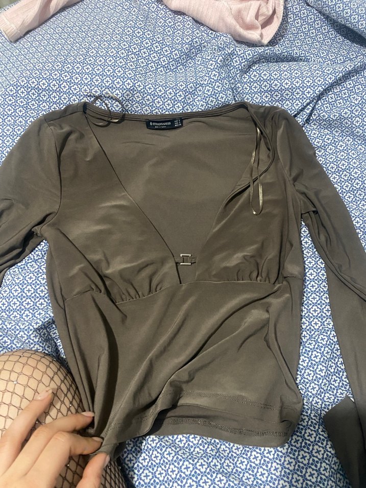 V yaka, tokalı ve askılı kollu, gri renkte, sentetik kumaştan yapılmış, vücuda oturan kadın bluz. Günlük sokak stili için uygundur.