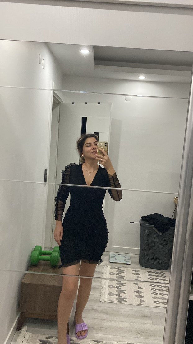 V Yaka Transparan Siyah Elbise