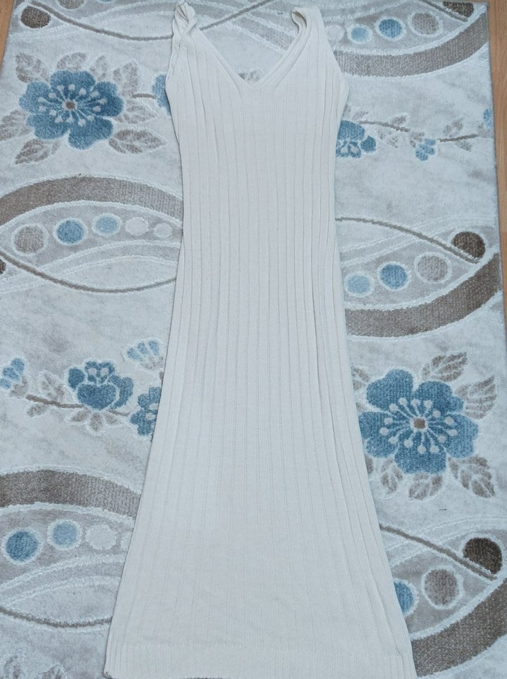 V yakalı ve kolsuz tasarıma sahip, beyaz renkli triko uzun elbise. Yumuşak sentetik kumaştan, bohem ve rahat bir stil sunar.