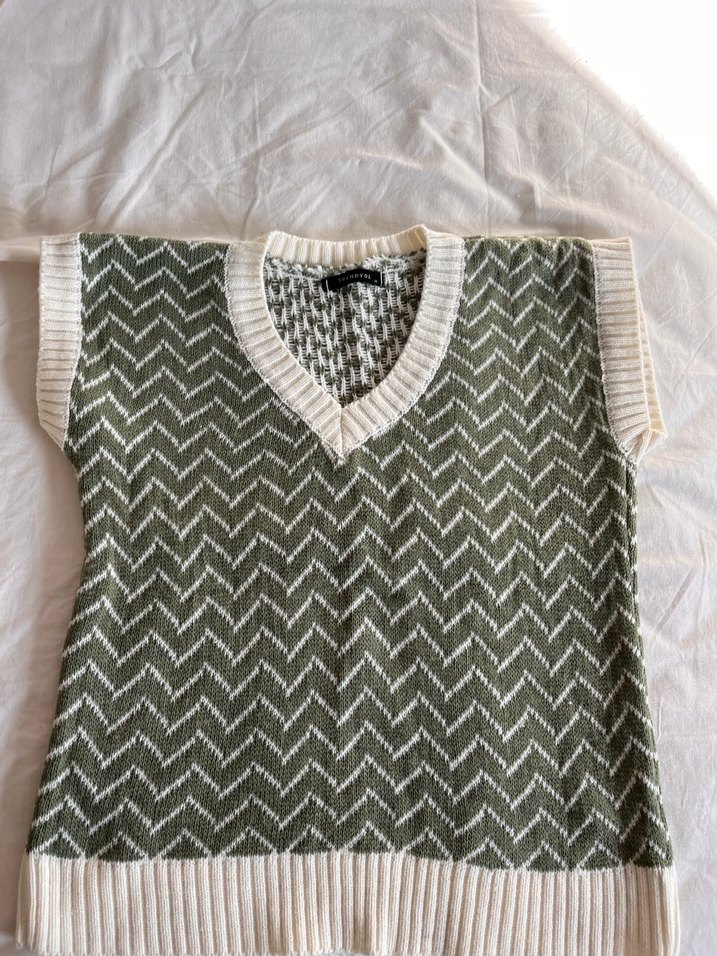 V yaka, kolsuz triko kadın süveter. Gri-yeşil zigzag desenli, rahat kesimli, günlük sokak stili için uygun.