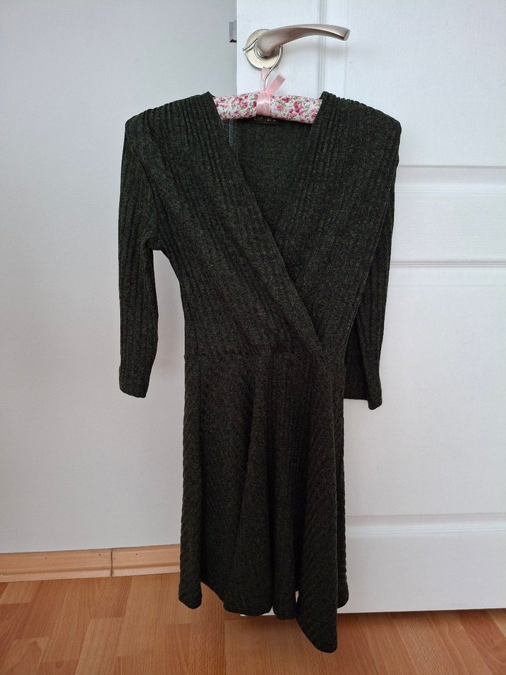 V yakalı, uzun kollu ve bol kesim triko midi elbise, rahat ve sade bir günlük tarz sunar.