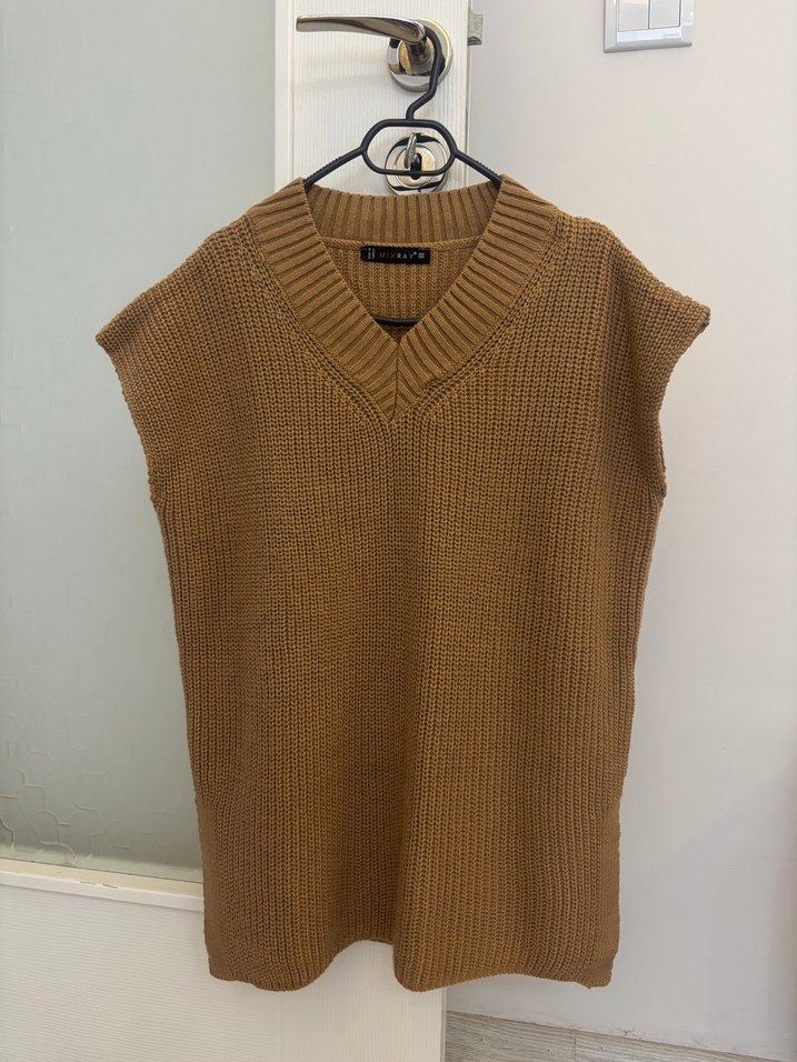 V yaka, örme, kolsuz, bol kesim triko süveter. Parlak görünümü ve midi uzunluğuyla rahat sokak stili için uygundur.