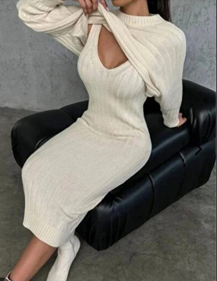 V yaka, askılı kollu ve uzun kesim triko elbise, yumuşak sentetik kumaştan, gündelik kullanıma uygun beyaz-gri tonlarında.