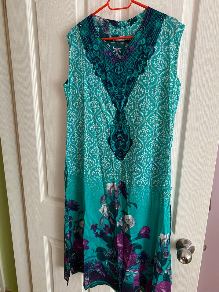 Kolsuz, bol kesim, V yakalı tuniği. Koyu turkuaz batik desenli ve çiçek detaylı, dökümlü tarzda. Günlük kullanım için rahat tekstil kumaş.