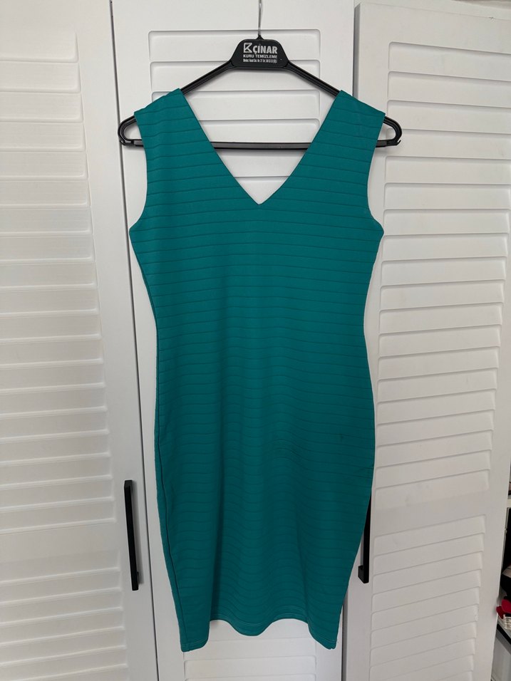 V yakalı, kolsuz, turkuaz renkli elbise. Bedenine oturan kesimi ve pilili dokusuyla midi boyda, günlük sokak stiline uygun.