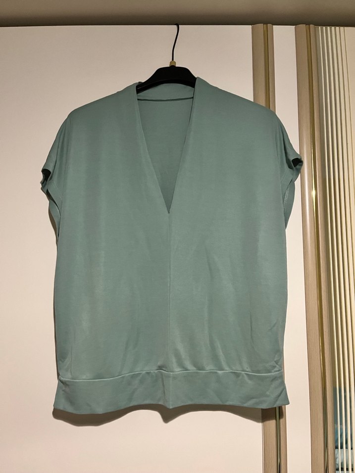 Gri renkli, V yakalı ve kısa kollu kadın tişörtü, bol kesim ve midi boydadır. Yumuşak sentetik kumaştan üretilmiş, rahat sokak stili için uygundur.