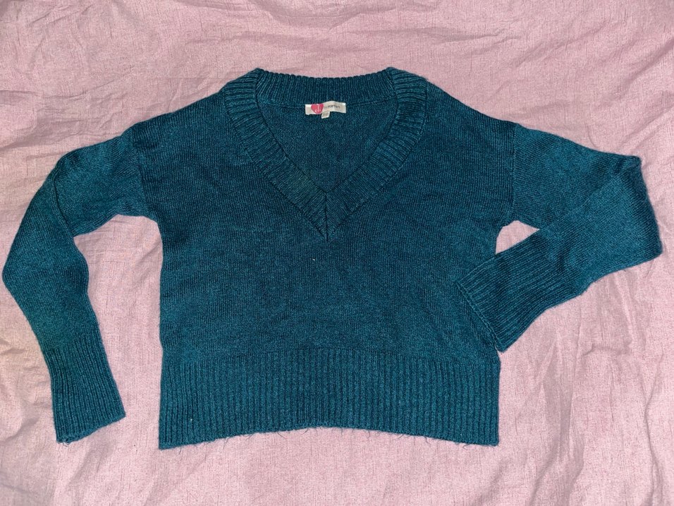 V yaka, turkuaz renkli, rahat kesim uzun kollu kadın triko kazak, günlük kullanıma uygundur.