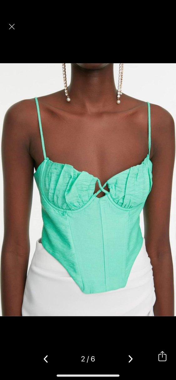 V yakalı, ince askılı turkuaz büstiyer, fırfır detaylı ve kısa boylu. Cesur sokak stili için uygun, partiye ideal.