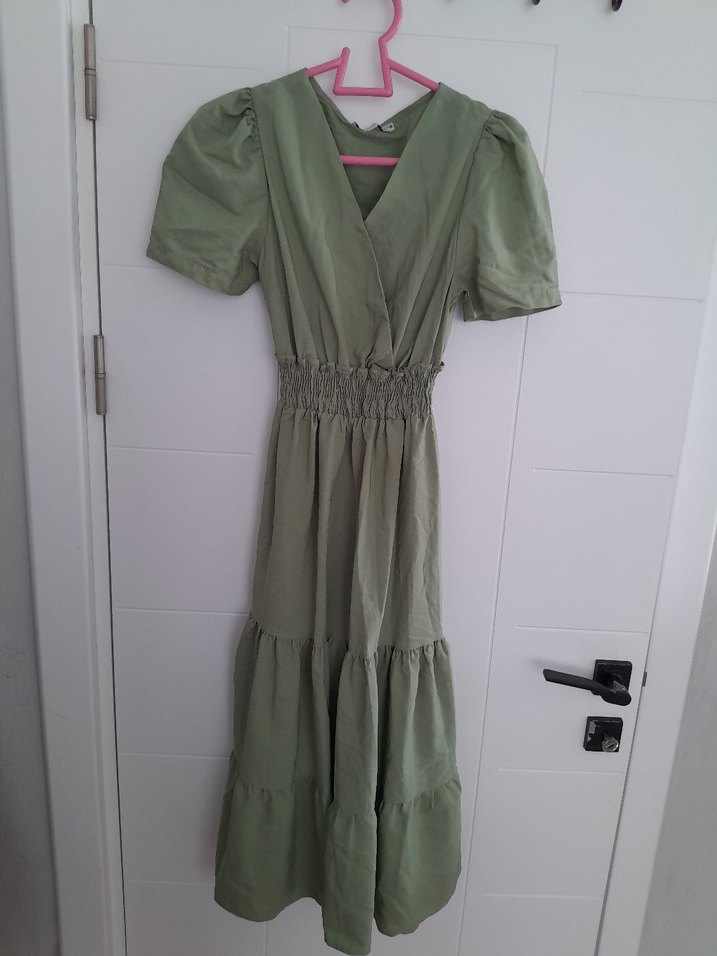 V yakalı ve bol kesimli uzun elbise. Bohem ve minimalist tarzda, günlük kullanım için uygun.