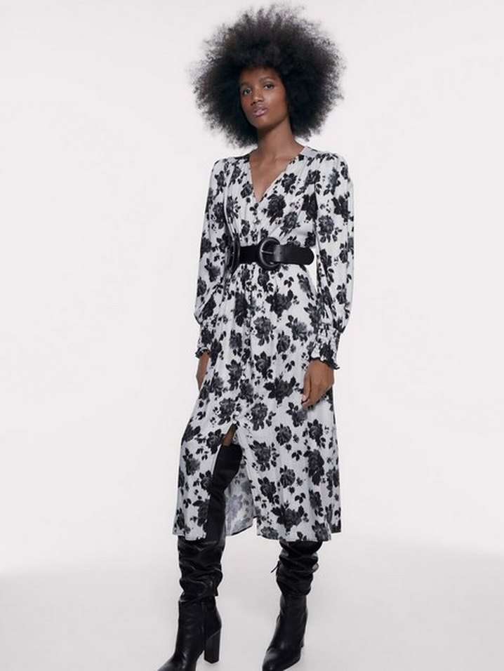V yaka, uzun kollu, bol kesim kadın elbisesi. Gri bağlama desenli, düğmeli ve sentetik kumaştan yapılmıştır. Günlük kullanım için uygundur. Kullanılmadı kumaşı pamuklu viskon kumaş. Omuzlarında kendi kumasindan yumuşak vatka var. Sonbahar kış için uygun. S-M uygun
