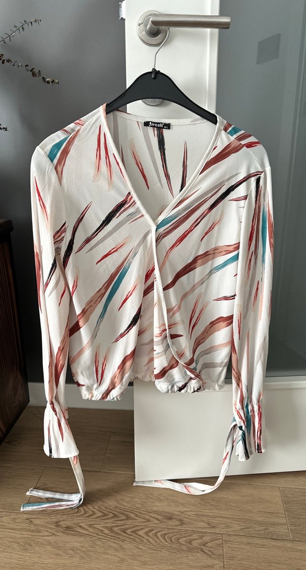 Uzun kollu, V yaka ve batik desenli, dökümlü tasarıma sahip bol kesim bluz. Sentetik kumaştan, günlük sokak stiline uygun.