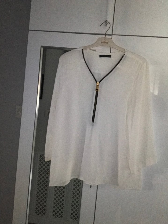 V yaka ve fermuar detaylı, uzun kollu, bol kesim beyaz gömlek. Pürüzsüz sentetik kumaştan üretilmiştir, günlük sokak tarzına uygundur.