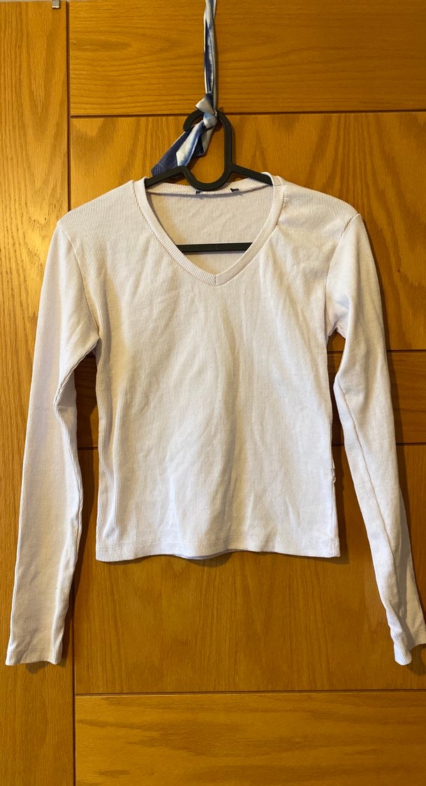 Uzun kollu, bisiklet V yakalı, beyaz kadın bluz. Yumuşak kumaştan, sade ve minimalist tarzda, günlük kullanım için uygun. Normal midi boyda, desensiz ve şık sokak stili için ideal.