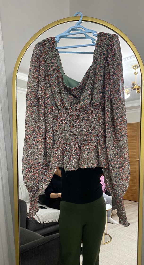 V yaka ve uzun kollu, bol ve drapeli kesime sahip kadın bluz. Koyu çok renkli bohem desenli, midi boyda ve yumuşak sentetik kumaştan üretilmiştir.
