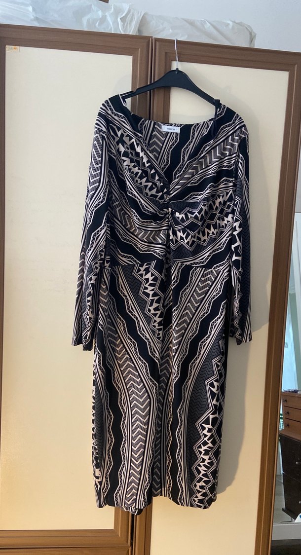 V yaka, uzun kollu, drapeli, bohem desenli, kahverengi triko elbise. Ofise uygun şık ve rahat yapıda, sentetik yumuşak kumaştan üretilmiştir.
