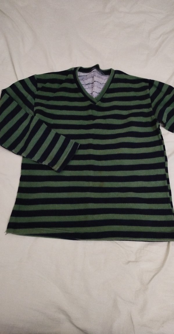Koyu yeşil ve siyah çizgili, V yakalı, uzun kollu kadın kazak. Rahat kesimli, normal boyda, yumuşak sentetik örme kumaştan yapılmıştır, gündelik sokak stili için uygundur.