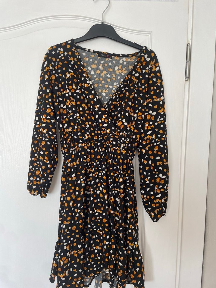 Koyu kahverengi, V yakalı ve uzun kollu midi elbise. Rahat kesimli, drapeli ve desenli sentetik kumaştan, günlük sokak stili için uygun.