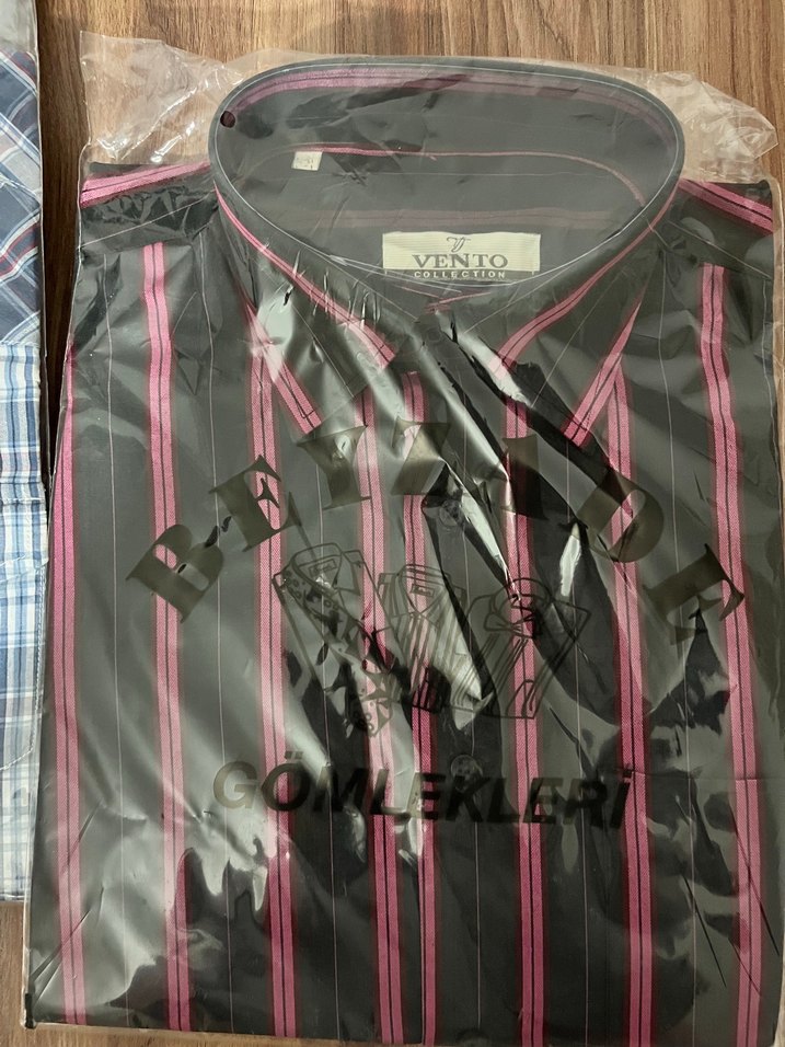 V yaka ve uzun kollu, regular fit erkek gömlek. Sentetik kumaştan, gri çizgili baskılı desene ve pile detayına sahip, günlük sokak stili için uygundur. VENTO markalı.