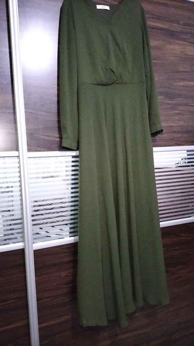 Drapeli ve V yakalı, uzun kollu bol kesim haki uzun elbise. Pürüzsüz sentetik kumaştan, ofis kullanımı için uygun 38.40 bedene uyumlu